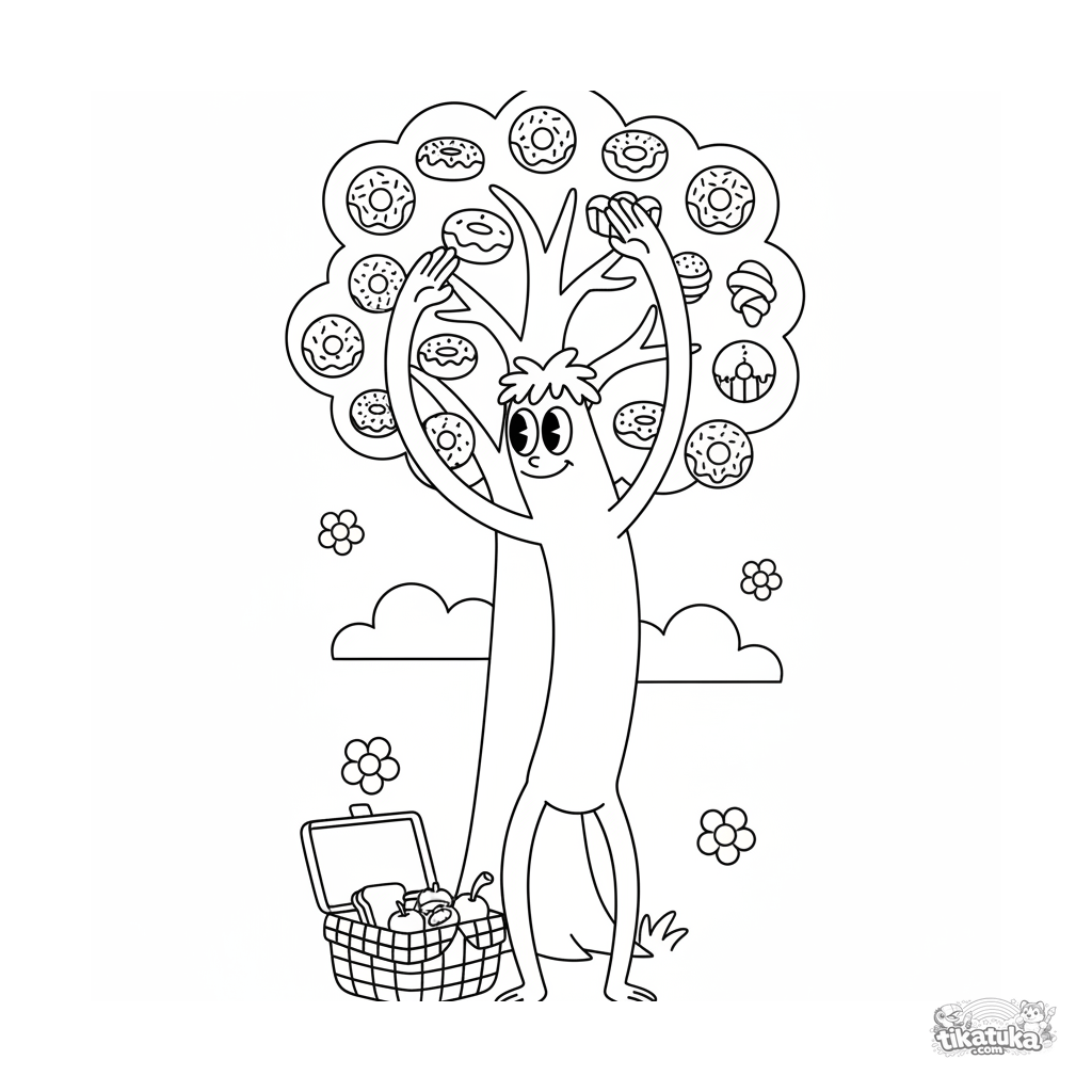 Coloring page for kids 7-9: a long-armed monster in a retro style reaches for a magical donut tree at a picnic. A dynamic and fantastical scene.