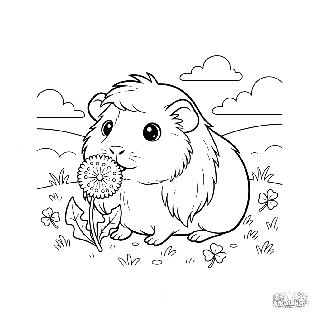 Coloring page for kids 4-6: a fluffy long-haired guinea pig in a meadow with a dandelion. A cute animal in a simple scene, perfect for coloring.