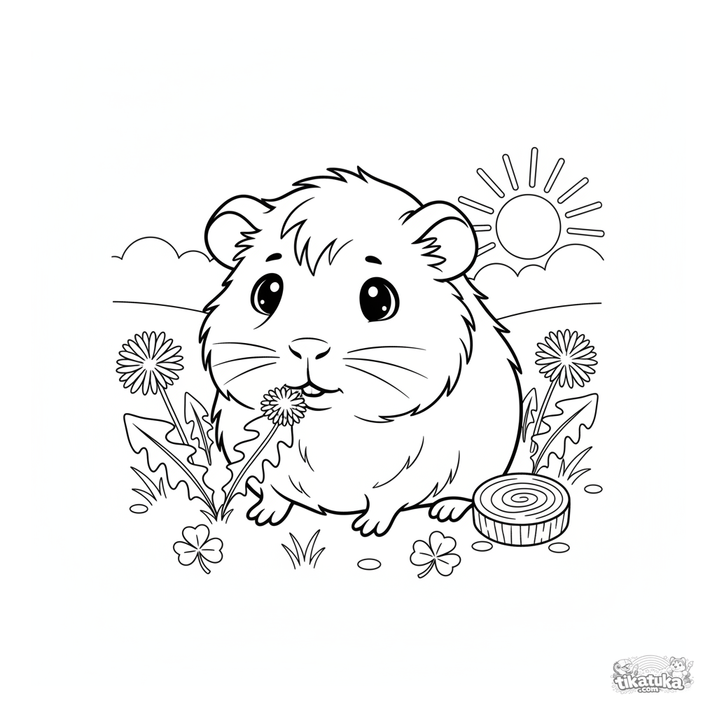 Coloring page of a cute guinea pig in a meadow. For kids aged 4-6. Features a fluffy long-haired guinea pig nibbling a dandelion leaf among clover, with a chew toy nearby.