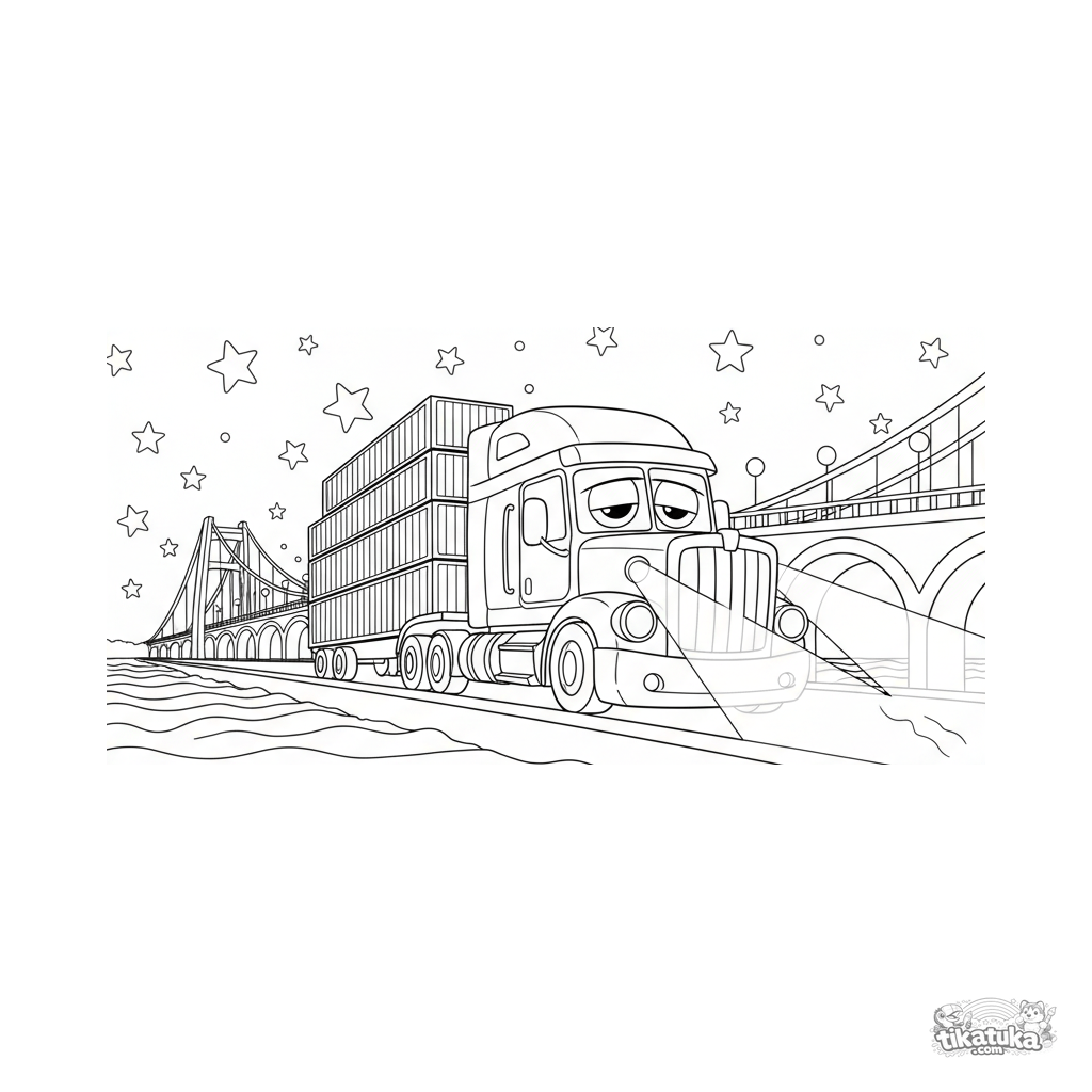 Coloring page for kids 7-9: a massive semi-truck carrying containers drives across a lit bridge over a river at night. Atmospheric graphic novel style scene.