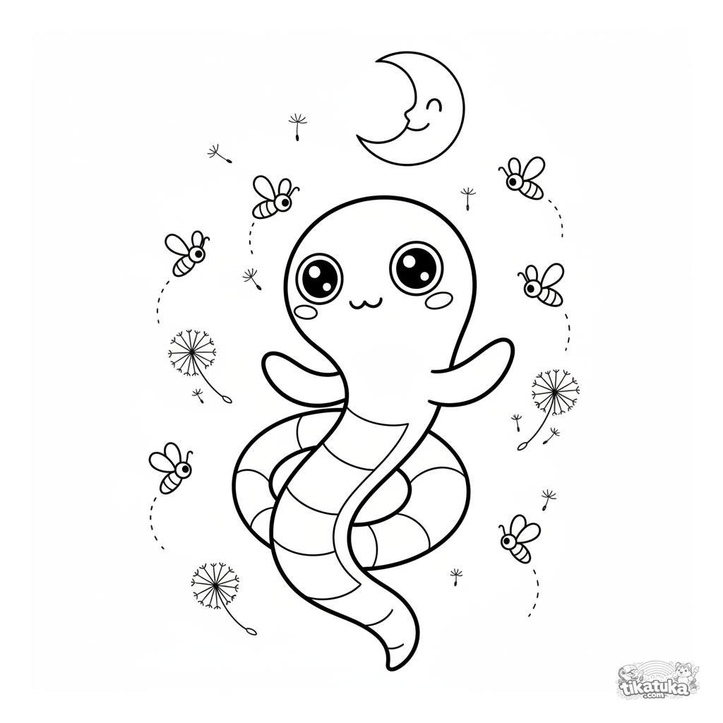 Kids coloring page: a long, flowing monster dances gracefully in a moonlit yard, surrounded by fireflies. A calm, dreamy scene perfect for coloring.