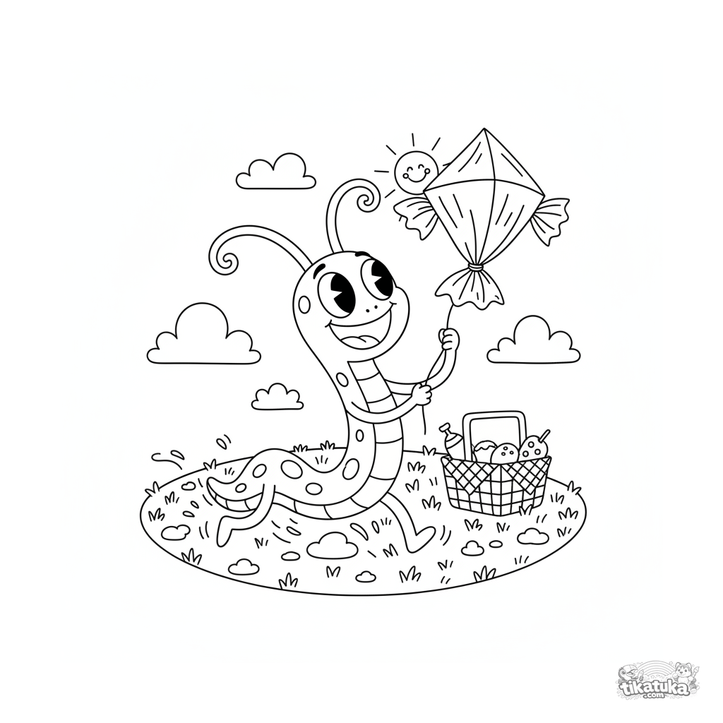 Retro-style coloring page for tweens 7-9: a long, rubber-hose monster runs flying a candy-wrapper kite at a picnic. Dynamic pose, simple background.