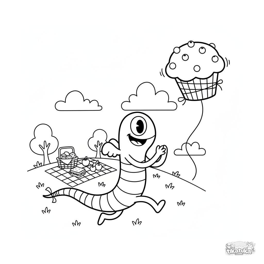 Coloring page for kids 4-6: a long rubbery monster flying a kite shaped like a blueberry muffin on a hill during a picnic. Fun retro scene, simple lines.