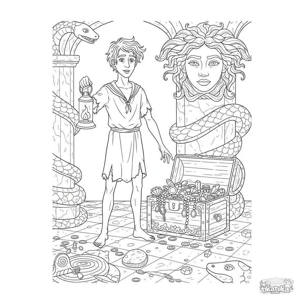 Complex coloring page for kids 10-12: a lost sailor finds a treasure chest in the gloomy lair of Medusa the Gorgon. Detailed scene in vintage engraving style.