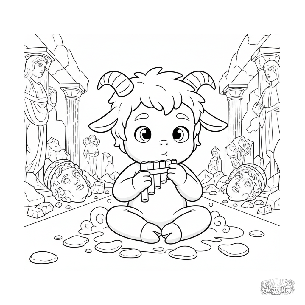 Kids coloring page: a young satyr tries to play pan flutes among stone statues in the Gorgon's lair. Cute expression, simple shapes, for ages 4-6.