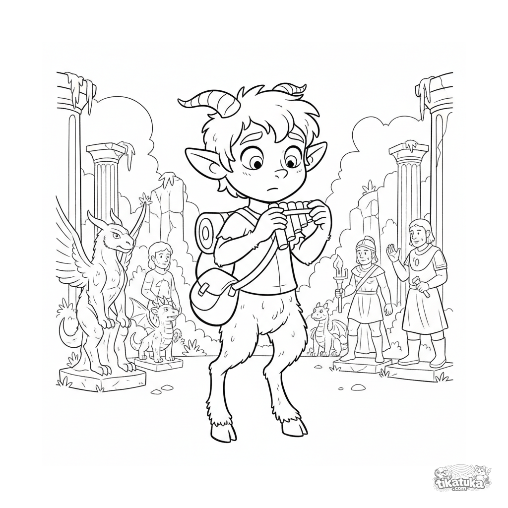 Coloring page for kids 4-6: a satyr musician lost in Medusa's lair playing for stone statues. Clear shapes, understandable scene.