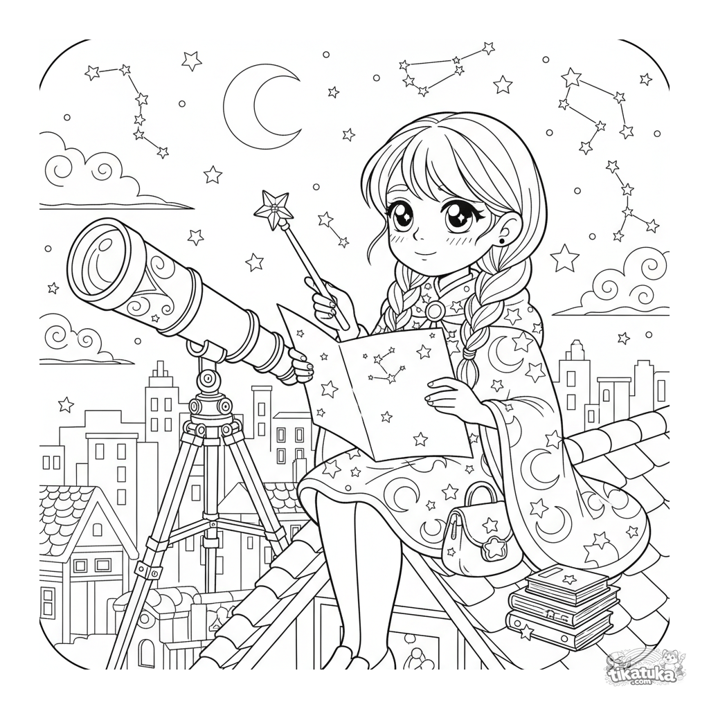 Kodomo anime-style coloring page: a magical girl studies the stars from a city rooftop. Unique scene with telescope and star chart for ages 10-12.