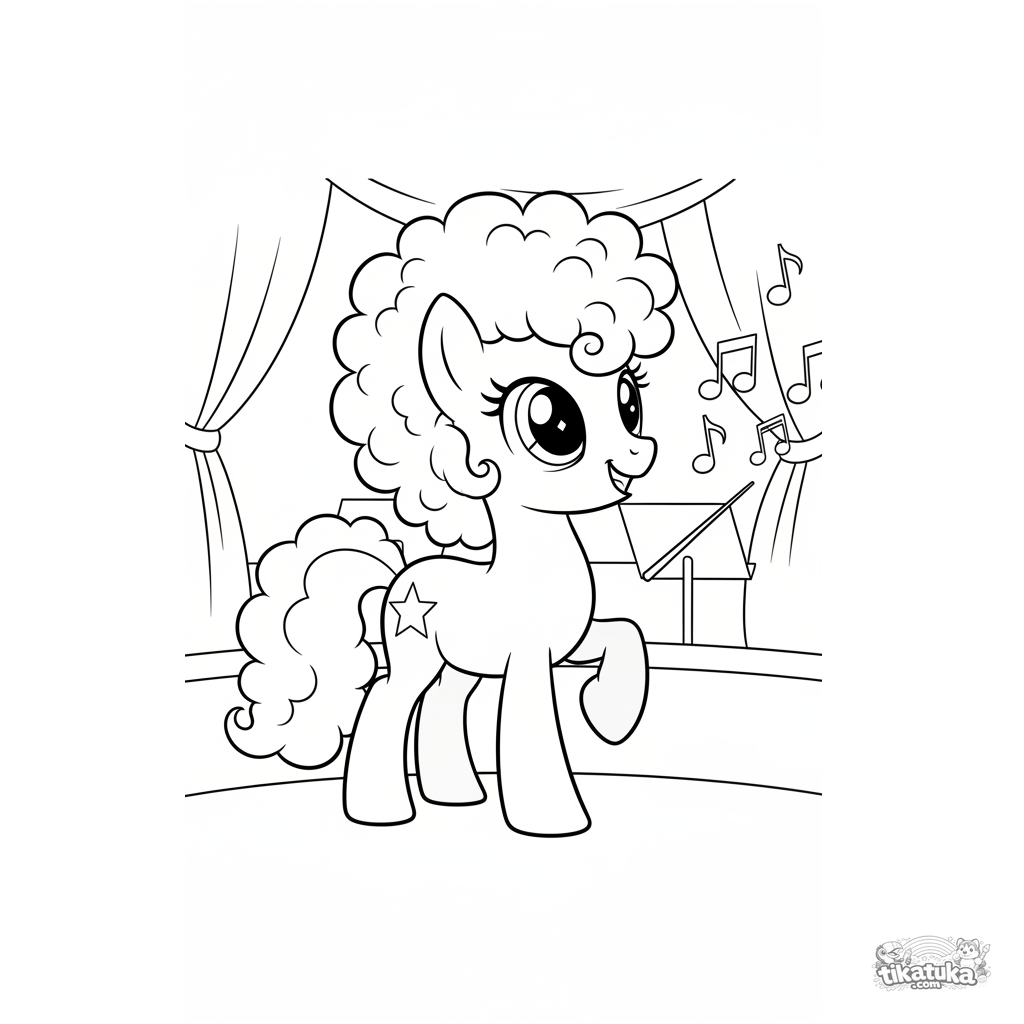 Coloring page for kids 7-9: a magical pony conductor stands in the orchestra pit before a stage, creating magical notes with her baton.