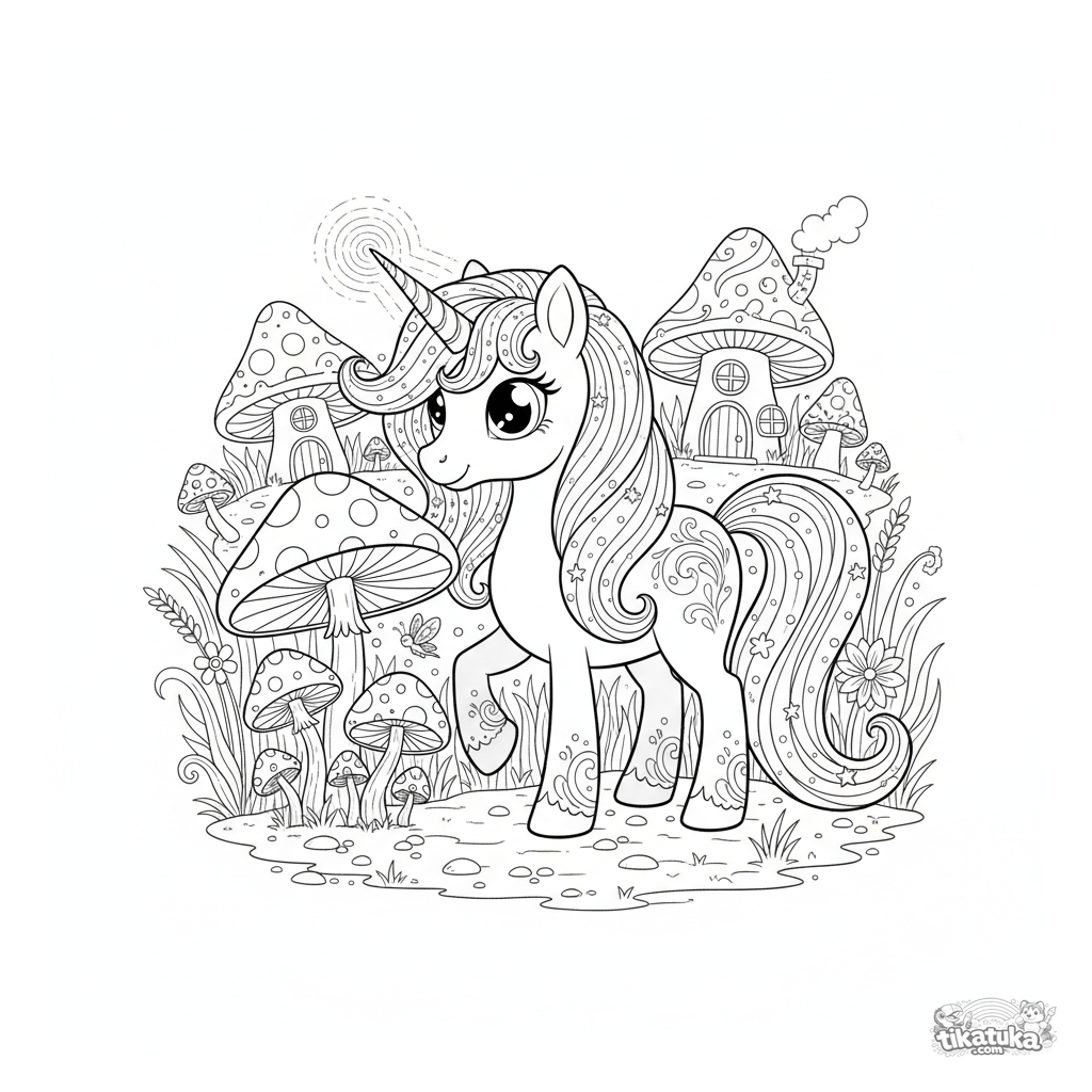 Hard coloring page of a magical pony grazing in an enchanted meadow among glowing mushrooms and fairies. For kids aged 8 and up.