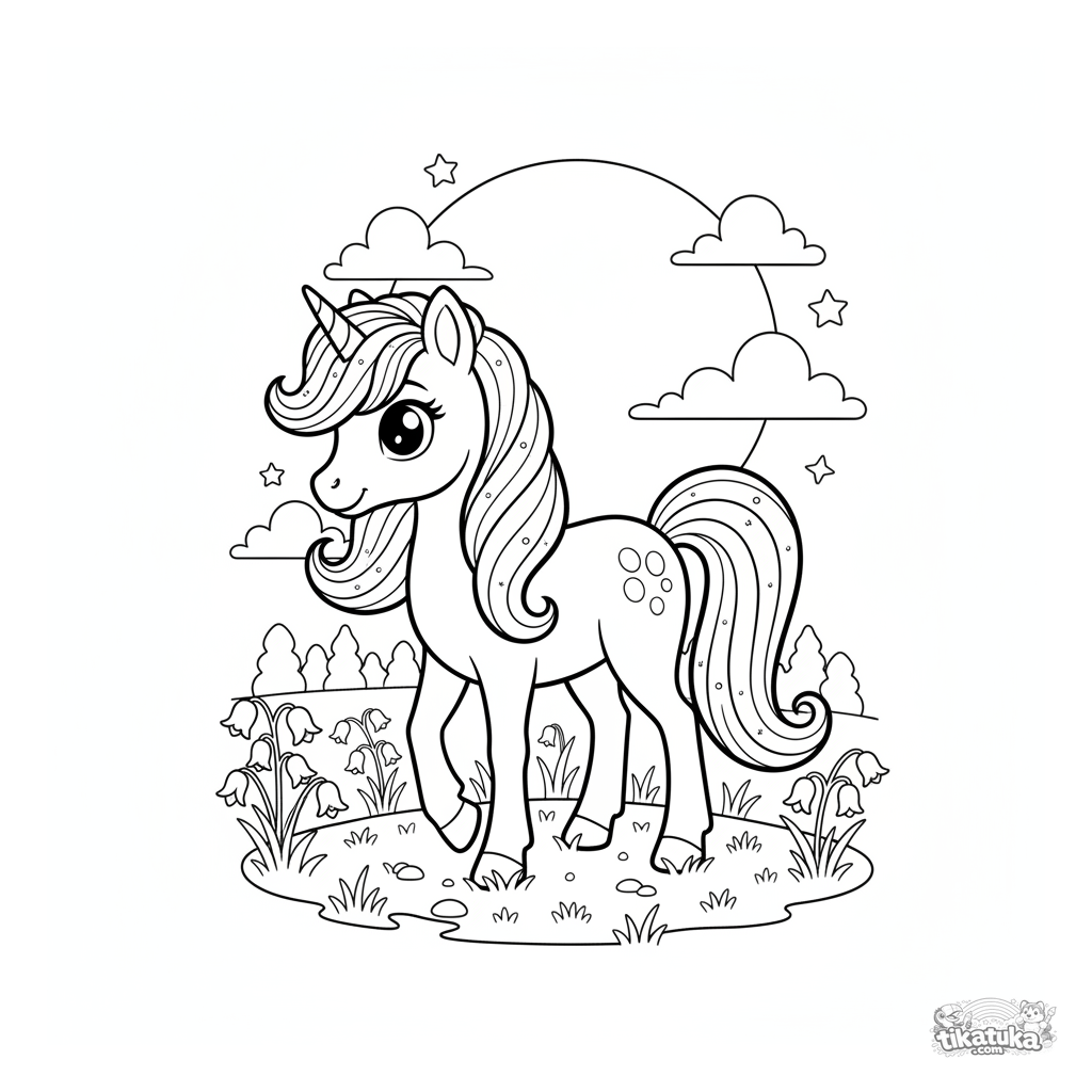Coloring page for girls 4-6: a magical pony with a glowing mane in a moonlit meadow. A fairy-tale and peaceful scene, perfect for coloring.