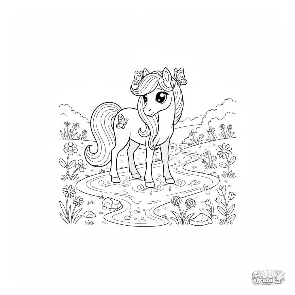 Coloring page of a magical pony with a water-like mane grazing by a crystal creek. For kids 4-6 years old. Scene with butterflies and wildflowers.