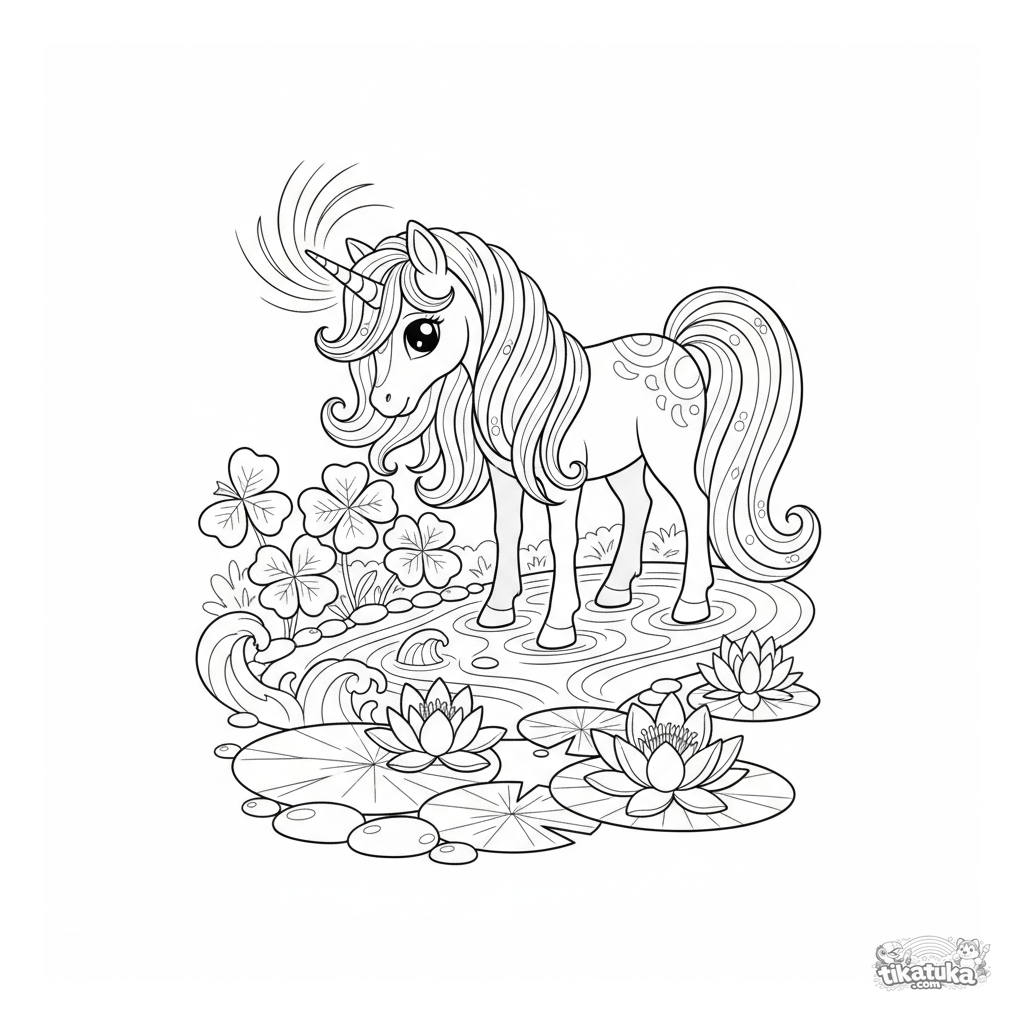 Coloring page of a magical pony with a water-like mane grazing by a creek. An enchanted, detailed scene for kids aged 6-9 to color.