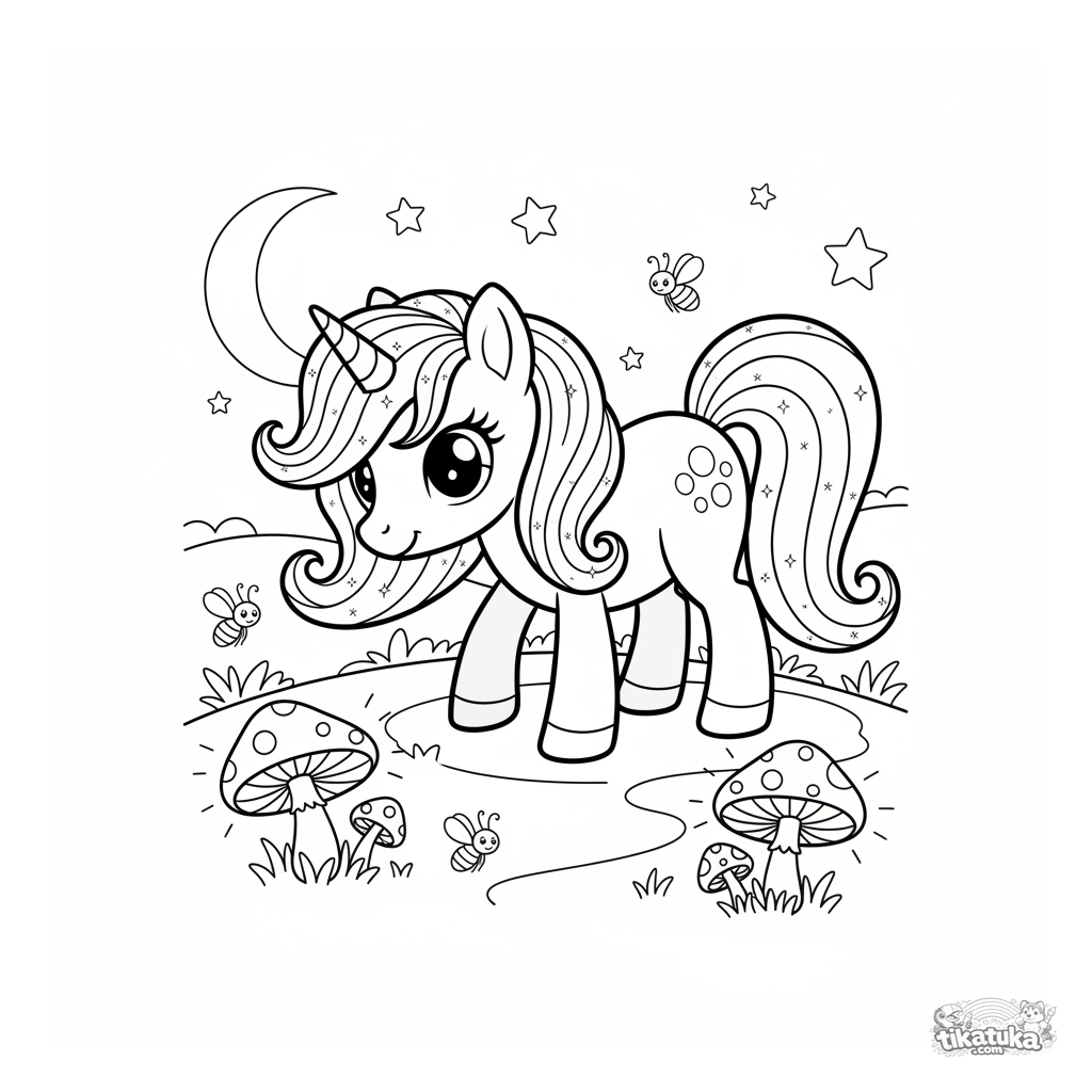 Coloring page for girls 4-6: a magical pony with a horn grazes in a moonlit meadow with glowing mushrooms. A fairy-tale and gentle scene for imagination.