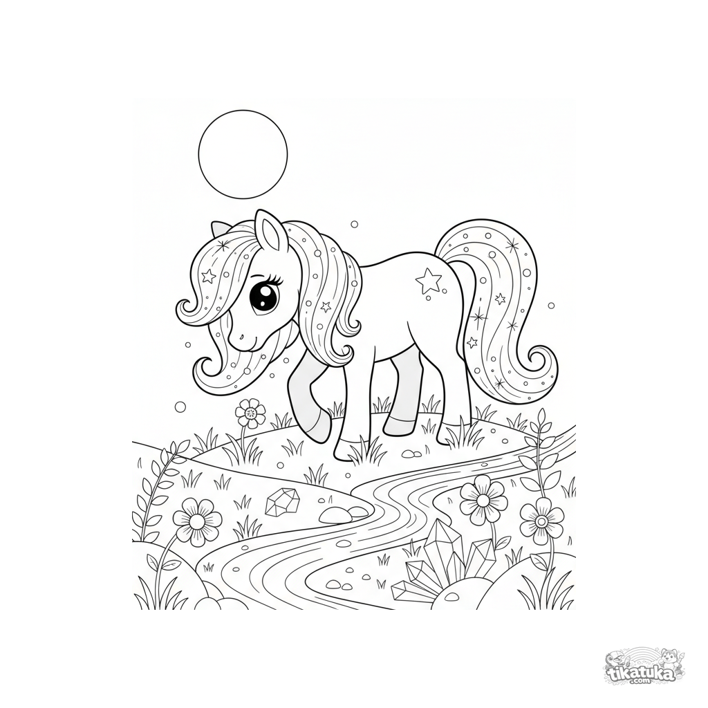 Coloring page for girls 7-12: a magical pony with a starry mane grazes in a moonlit meadow. A detailed, enchanting scene with beautiful elements to color.