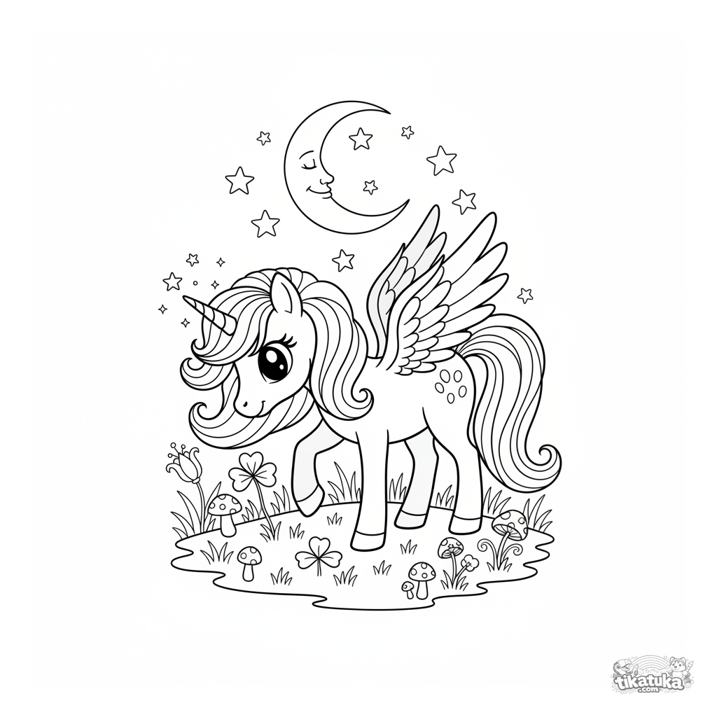 Magical coloring page with a pony for girls 4-6 years old. A graceful pony with feathery wings and a horn grazes peacefully on clover in the moonlight, surrounded by glowing mushrooms.