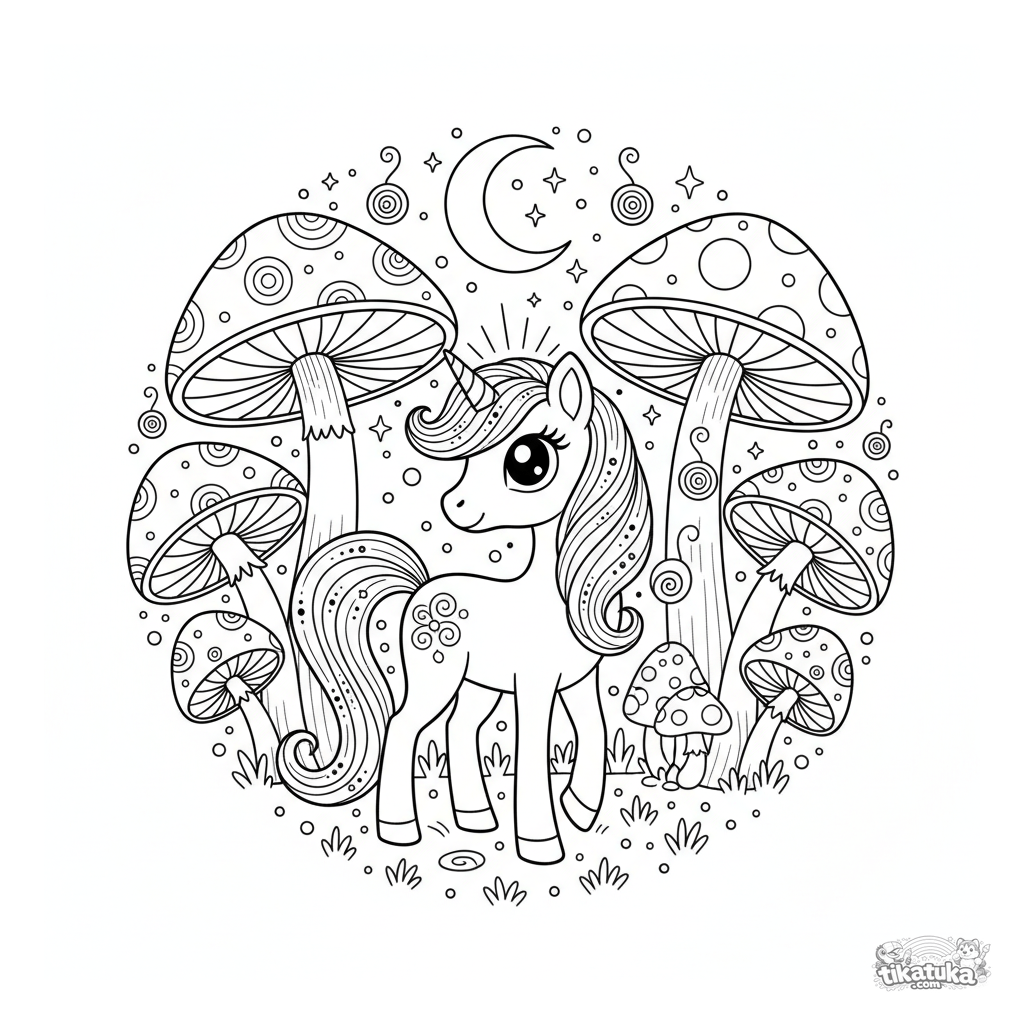 Coloring page of a magical pony grazing in a moonlit mushroom ring. For kids aged 6-9.