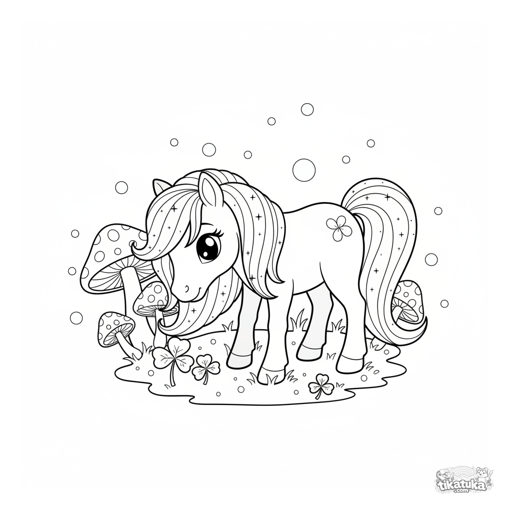 Coloring page for girls 4-6: a magical pony with a sparkling mane grazes peacefully in an enchanted meadow at dusk among glowing mushrooms and fireflies.