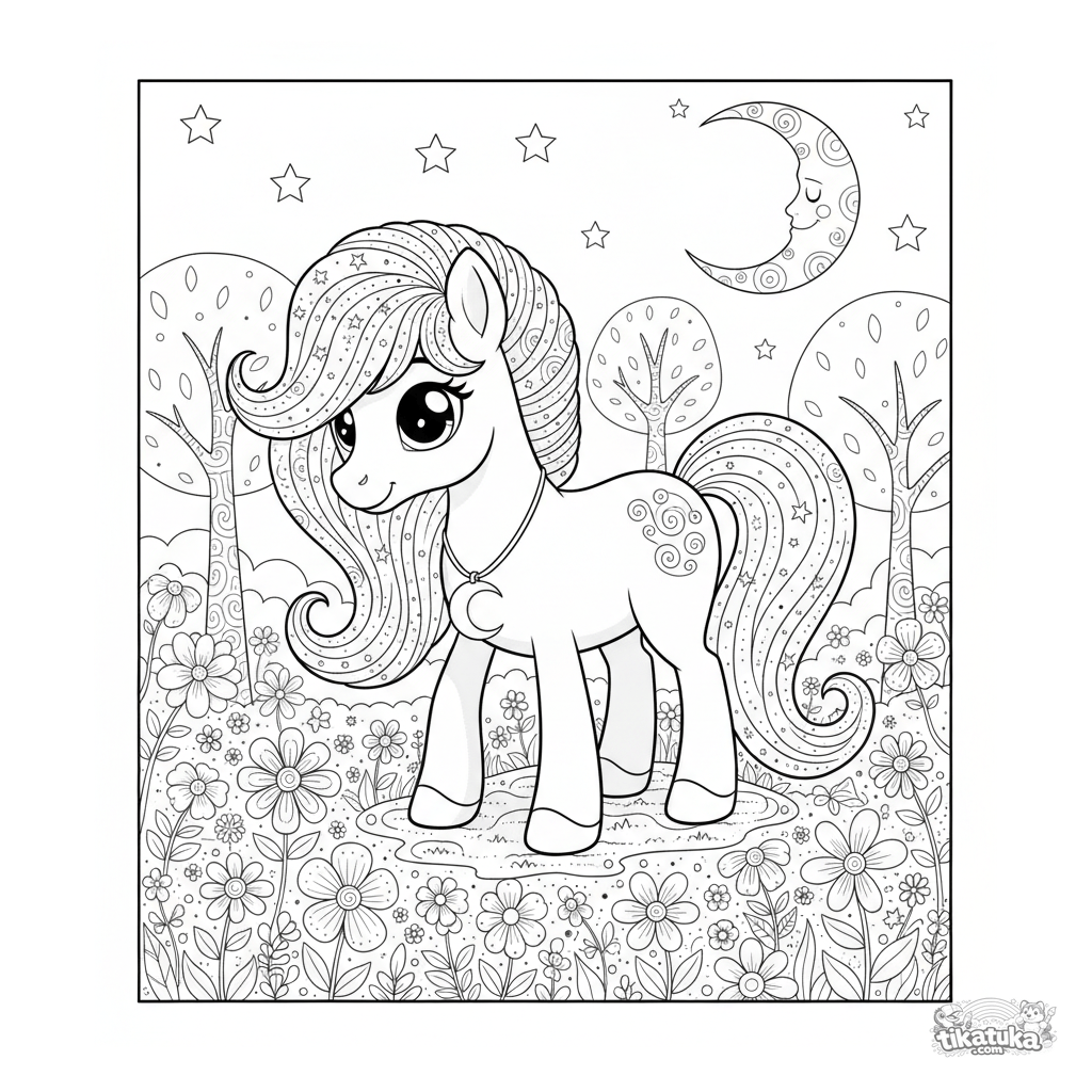 Coloring page of a magical pony with a sparkling mane grazing in a meadow of glowing flowers. For kids aged 6-9. A fantasy scene with beautiful, intricate details.