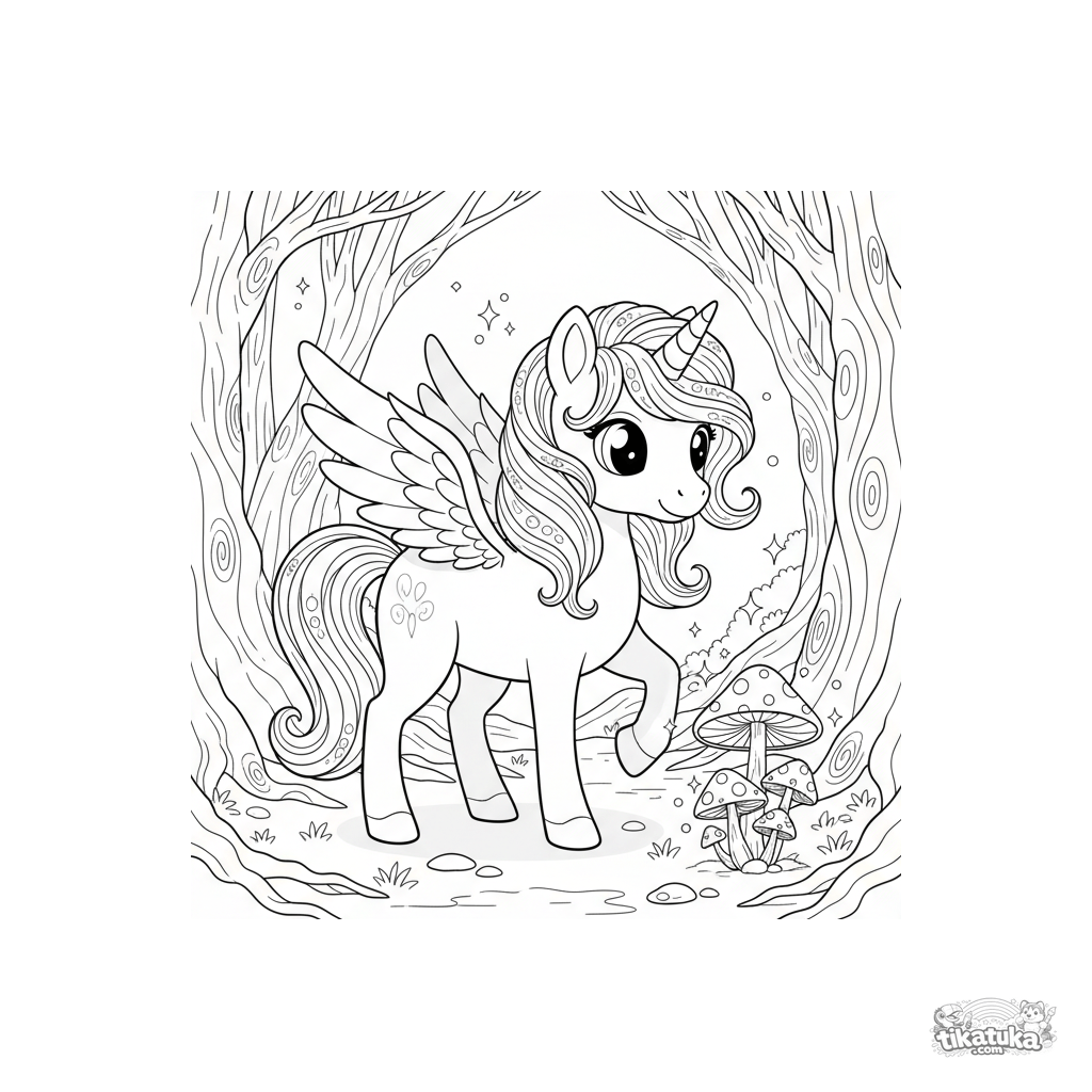 Coloring page of a magical winged unicorn pony in an enchanted forest. For kids 5-8 years old. The pony looks at glowing mushrooms, sparkling lights float around, and ancient tree roots are visible.