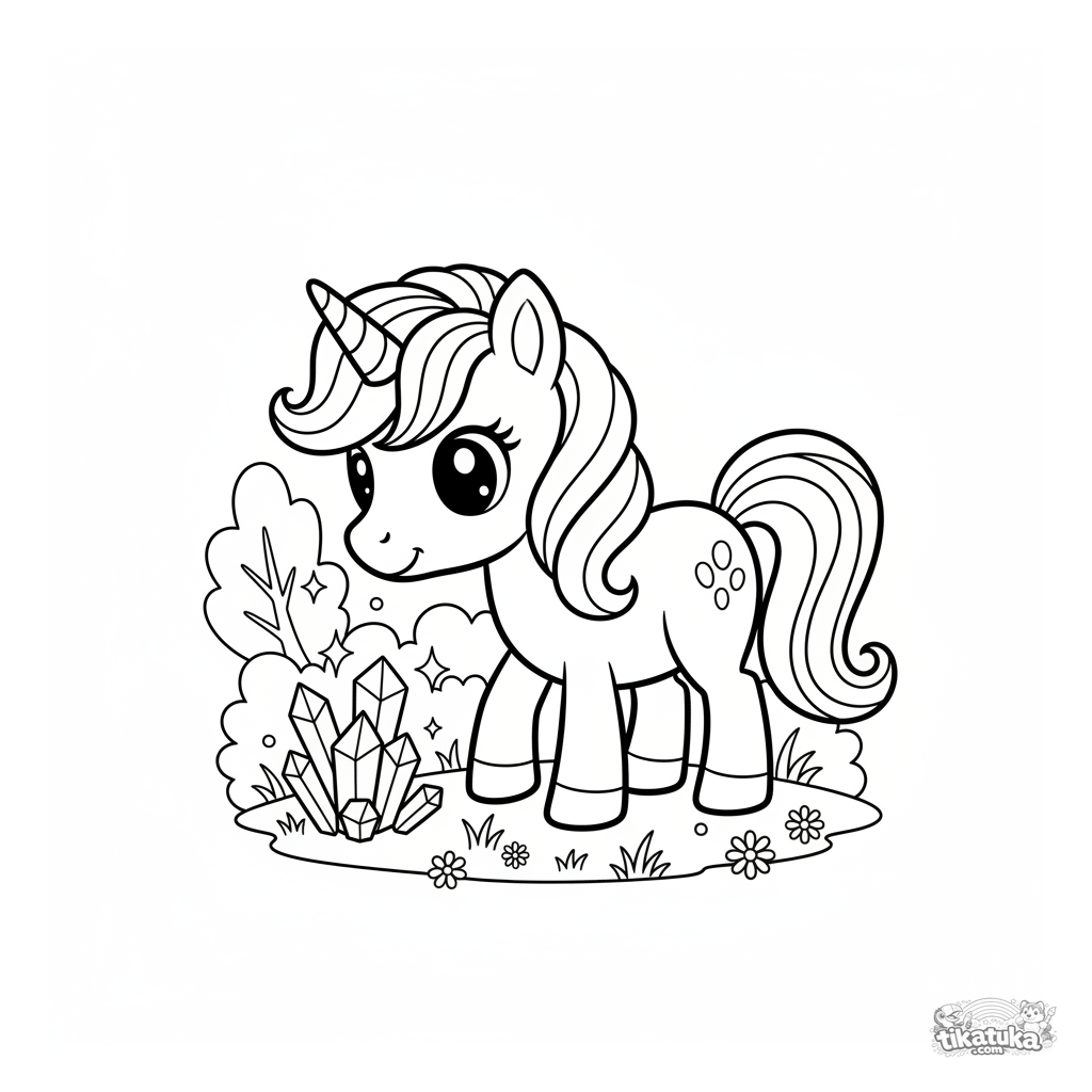 Coloring page for girls: a cute unicorn pony grazes in an enchanted meadow with crystal flowers. Suitable for kids 5-7, medium difficulty.