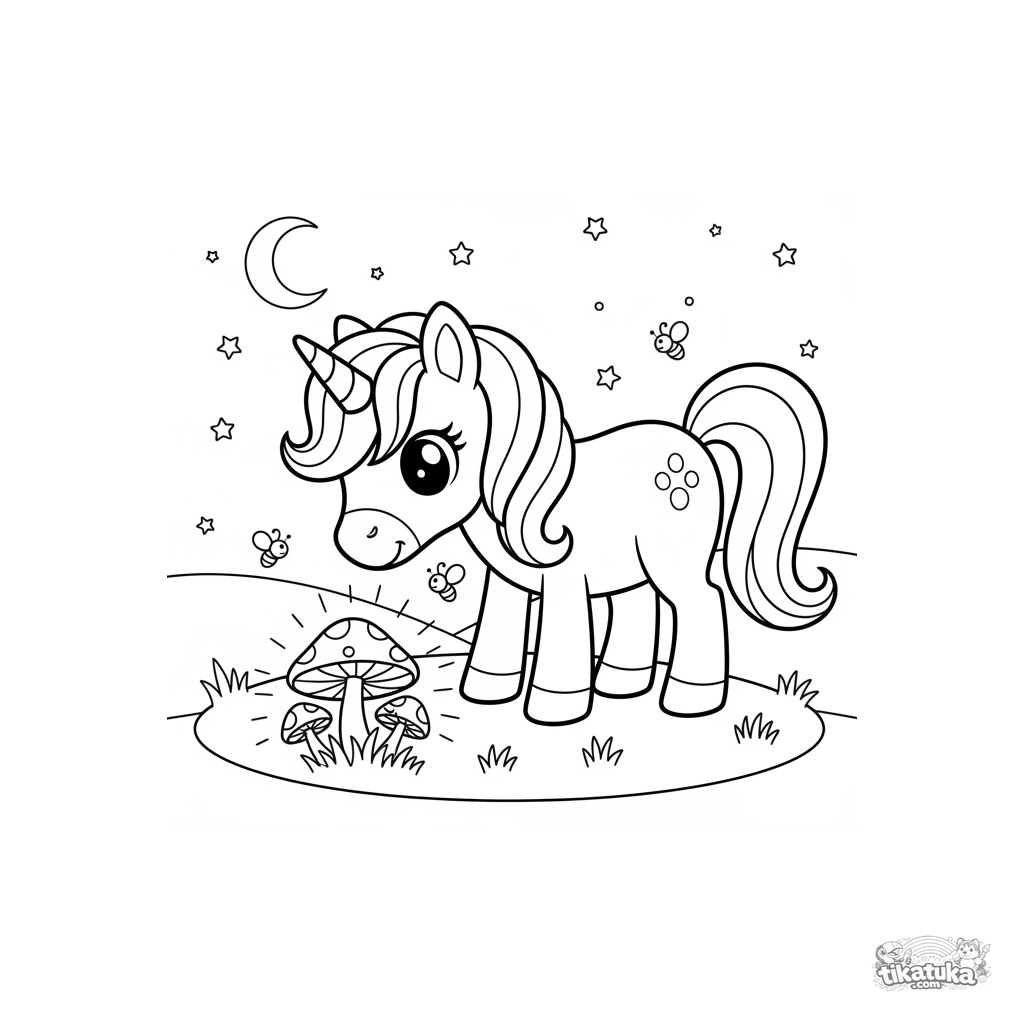 Coloring page of a magical unicorn pony grazing in a moonlit meadow near a ring of glowing mushrooms. For kids aged 3-6. A fairy-tale and peaceful scene.