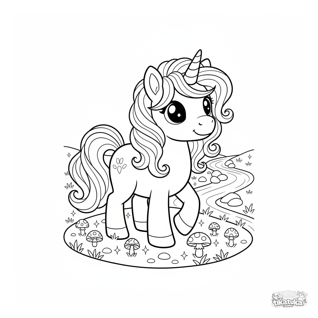Coloring page of a magical unicorn pony. For kids 3-6 years old. The unicorn grazes in an enchanted meadow with glowing mushrooms and flowers, a stream nearby. Simple, cute outlines.