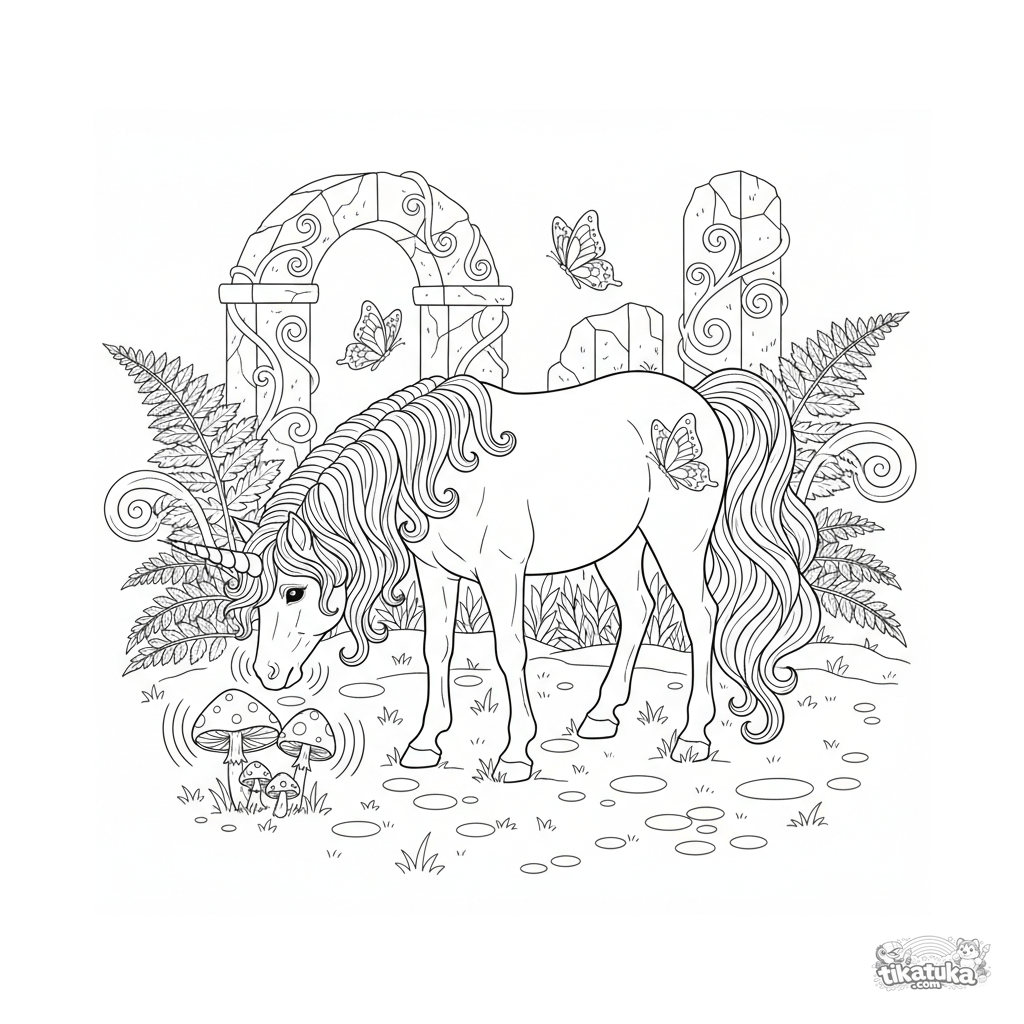 Coloring page of a magical unicorn pony with a flowing mane grazing on glowing mushrooms in an enchanted forest. For kids aged 6-9. A detailed fantasy scene.