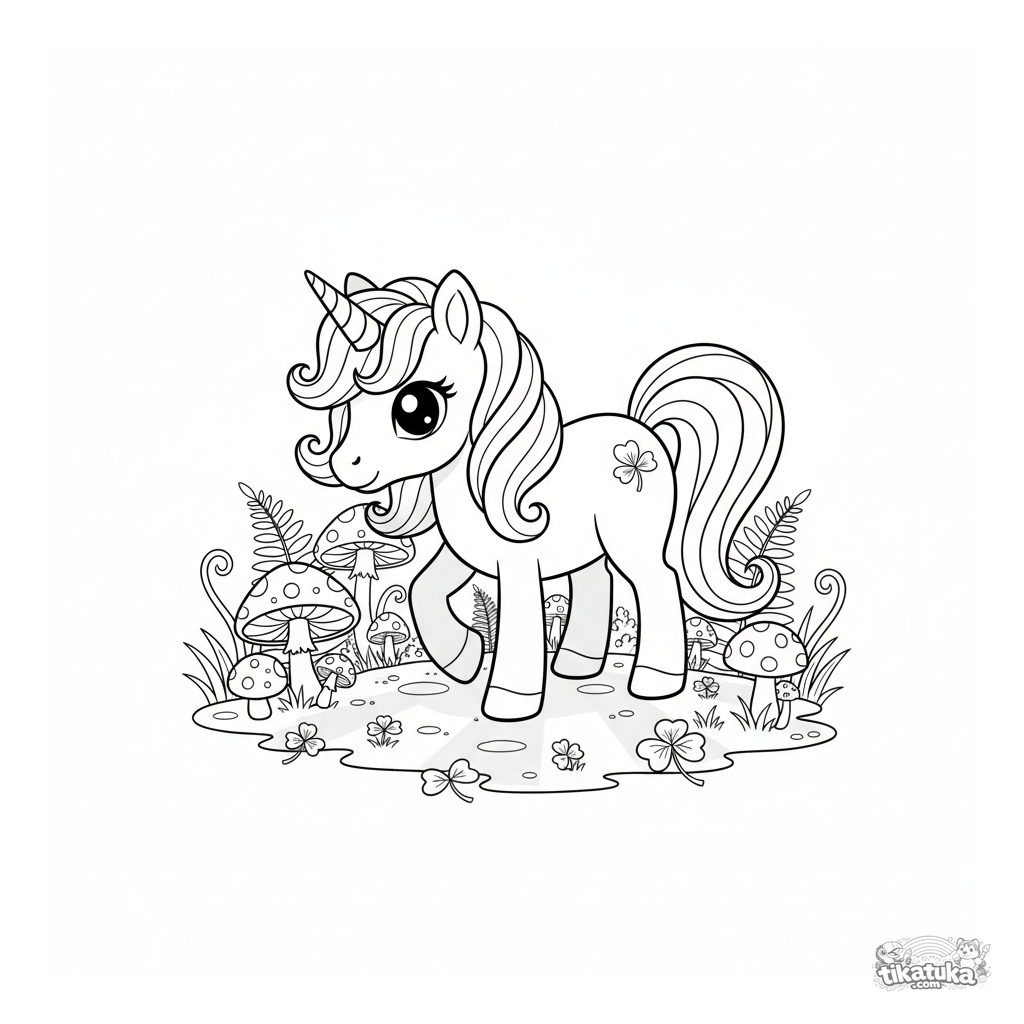 Coloring page for kids: a magical unicorn pony with a long mane grazes in an enchanted grove. Suitable for girls aged 4-6.