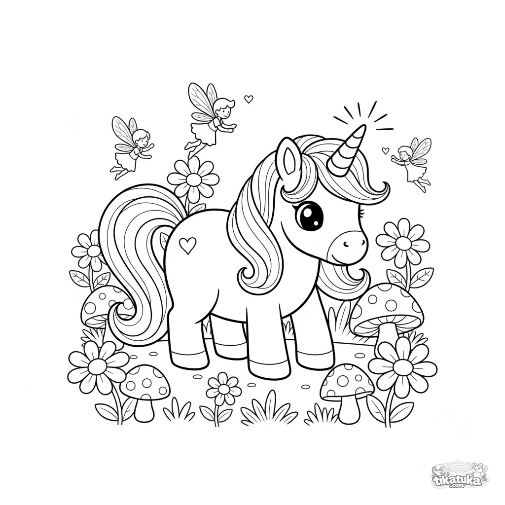Coloring page of a magical unicorn pony grazing in an enchanted meadow. For kids aged 3-6. Glowing mushrooms, fairies, and simple outlines.
