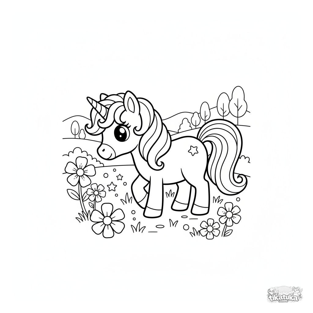 Coloring page for girls 4-6: a magical unicorn pony grazes in an enchanted meadow with glowing flowers. A cute and simple fantasy scene to color.