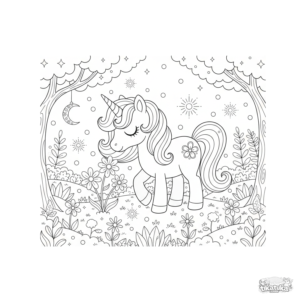 Intricate coloring page of a magical unicorn pony in an enchanted meadow. For kids aged 8-12. Many details, star-shaped flowers and glowing orbs.