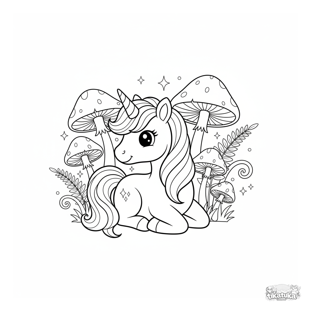 Coloring page for girls 4-6: a magical unicorn pony resting in an enchanted grove among glowing mushrooms. Pleasant details, flowing lines, perfect for creative coloring.