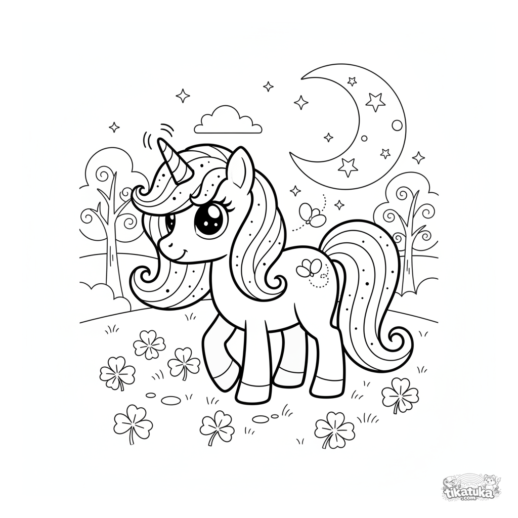 Coloring page for girls 4-6: a magical unicorn pony with a sparkling mane grazes in a moonlit meadow. A magical scene with fireflies.