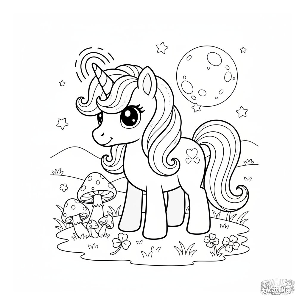 Coloring page for girls 4-6: a magical unicorn pony with a sparkling mane grazes in a moonlit meadow with glowing mushrooms. A fairy-tale and peaceful scene.
