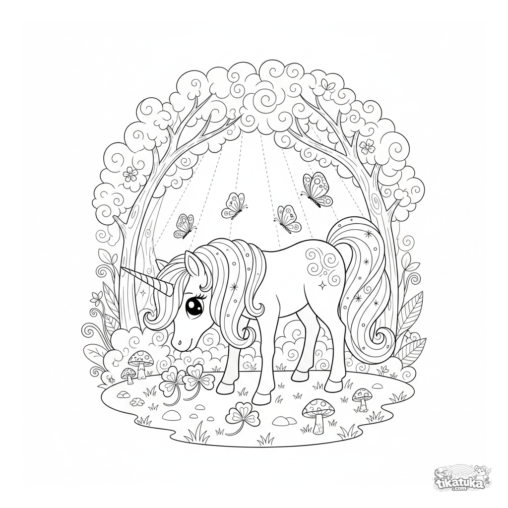 Detailed coloring page for girls 7-12: a magical unicorn pony with a sparkling mane grazes in a sun-dappled forest glade. Rich detail, textures, and a layered background.