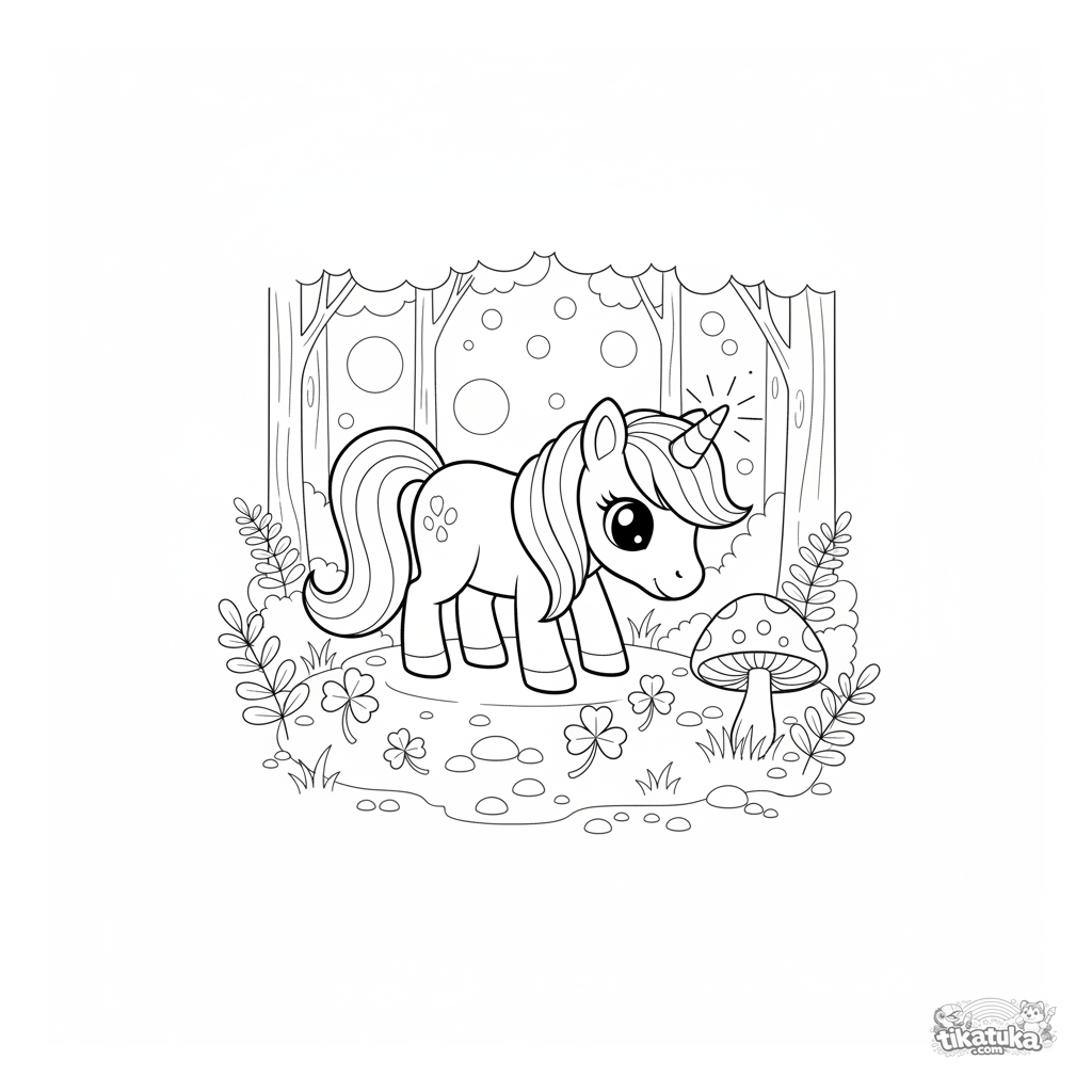 Coloring page of a magical unicorn pony grazing in an enchanted forest clearing next to a glowing mushroom. For girls aged 4-6.