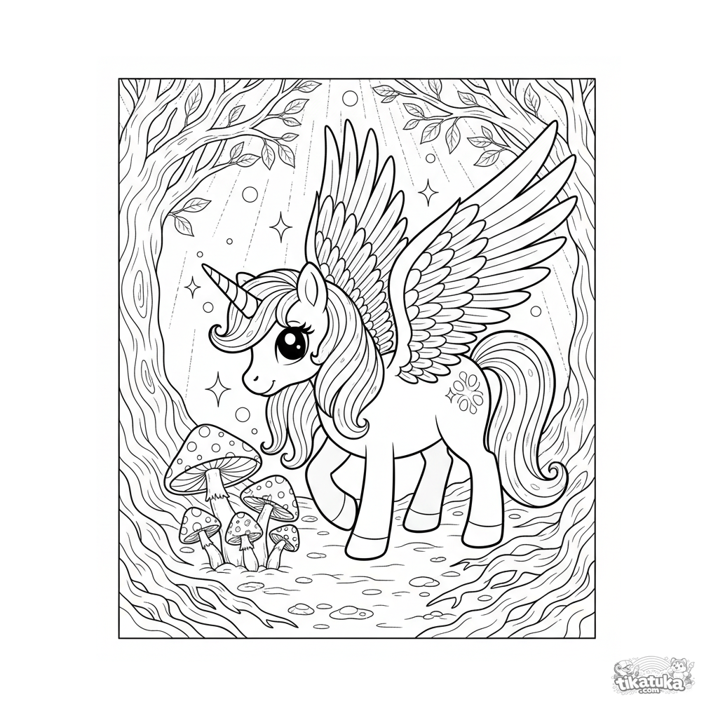 Coloring page of a magical unicorn pony with feather wings grazing among glowing mushrooms in an enchanted grove. For kids aged 5-8. Plenty of details for creative coloring.