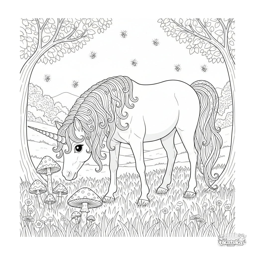 Detailed coloring page for older kids: a magical unicorn pony grazing under moonlight near glowing mushrooms. High detail for ages 7-12.
