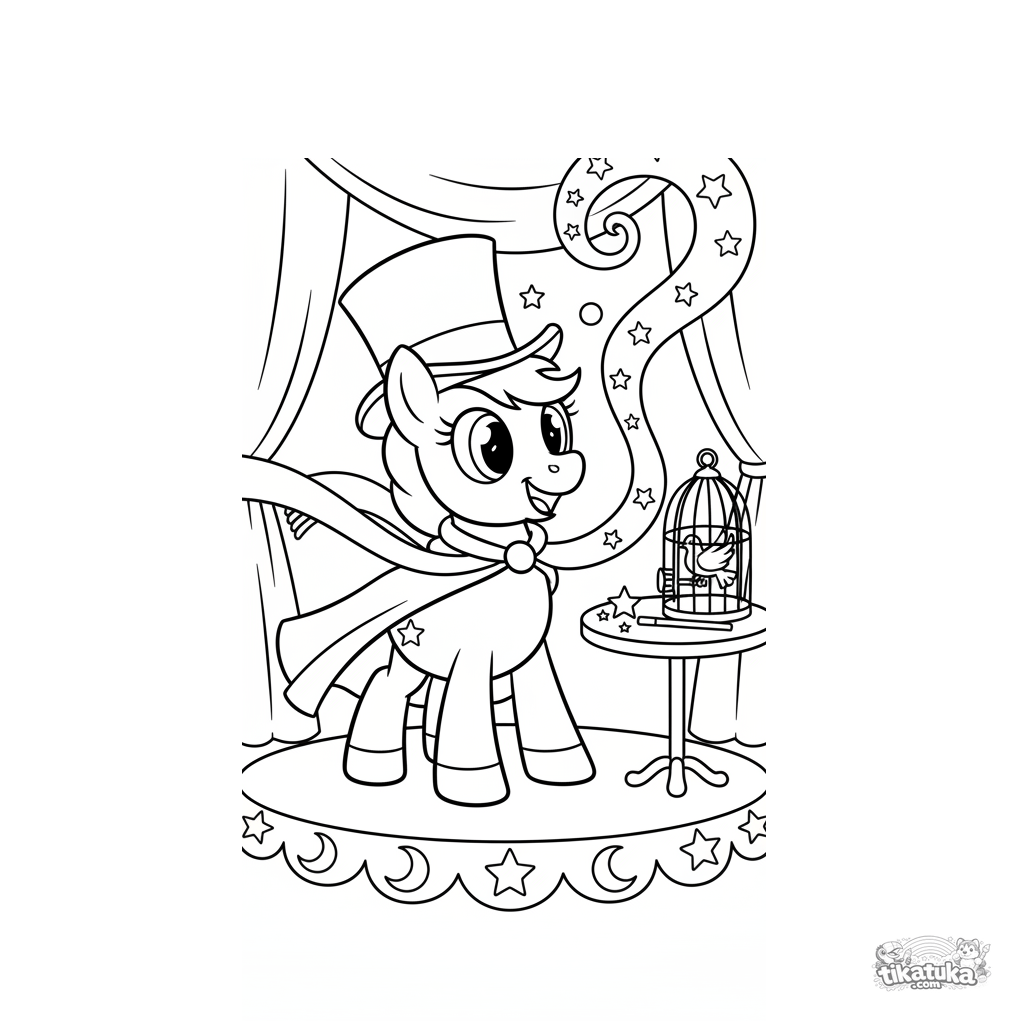 Fun coloring page for kids 4-6: a magician pony pulls an endless scarf from a hat on stage. Bright retro style, simple shapes, amusing story.