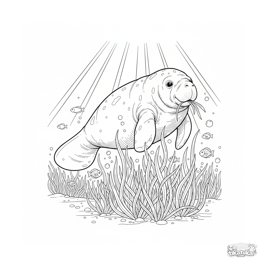 Detailed realistic coloring page for ages 10-12: a manatee grazing in a seagrass meadow in sunny shallow water. Anatomically accurate forms and textures.