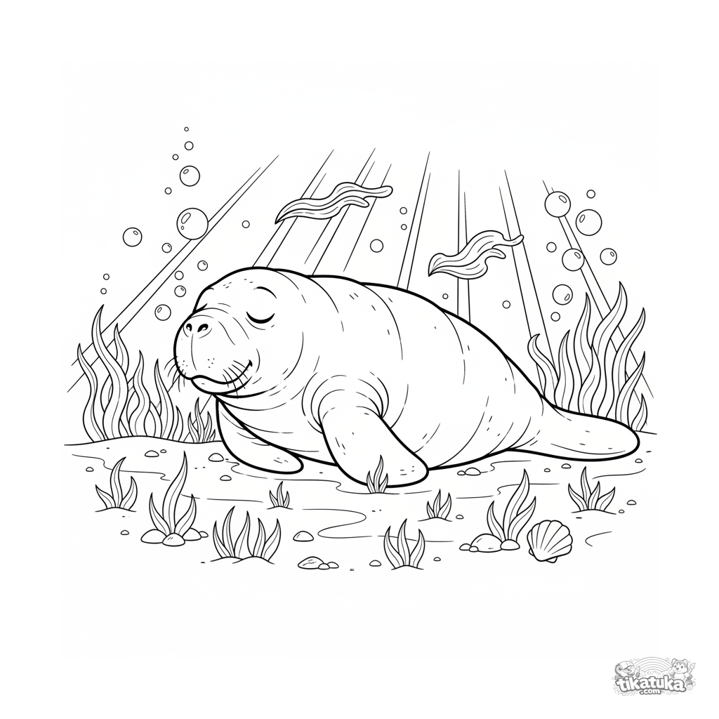Detailed coloring page of a sleeping manatee in sunlit shallows. Realistic skin texture and environment for older kids 10-12.