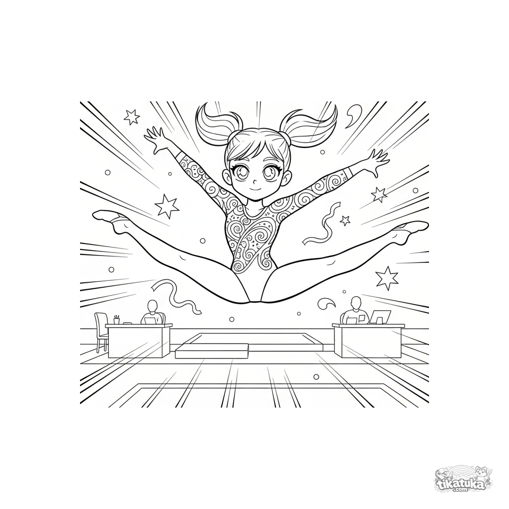Energetic manga-action coloring page for girls 10-12: a gymnast in a sparkly leotard performs a split jump during competition, with speed lines and impact stars.