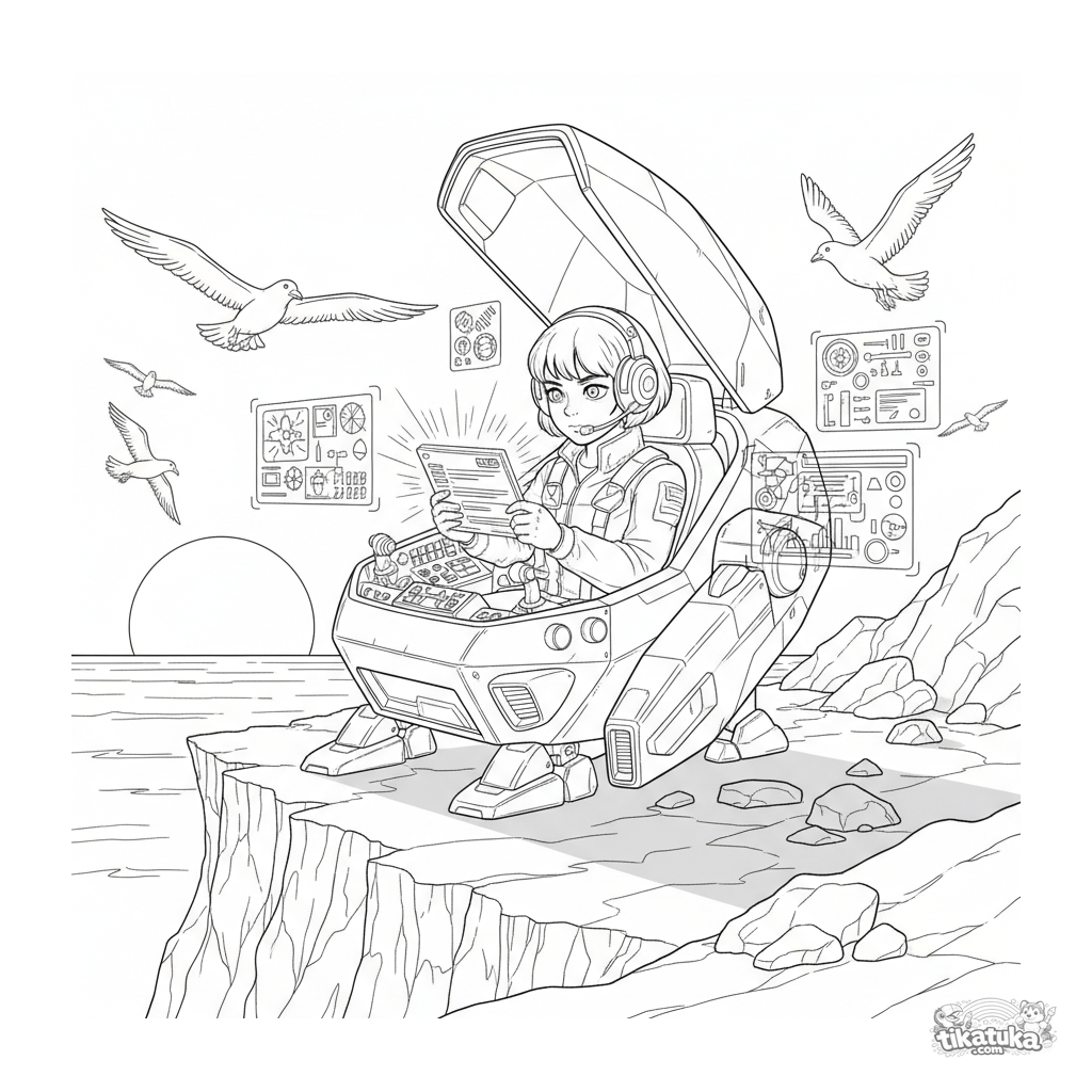 Detailed anime coloring page: a mecha pilot runs diagnostics in an open cockpit on a coastal cliff at sunset. For ages 10-12, with intricate background, holograms, and schematics.
