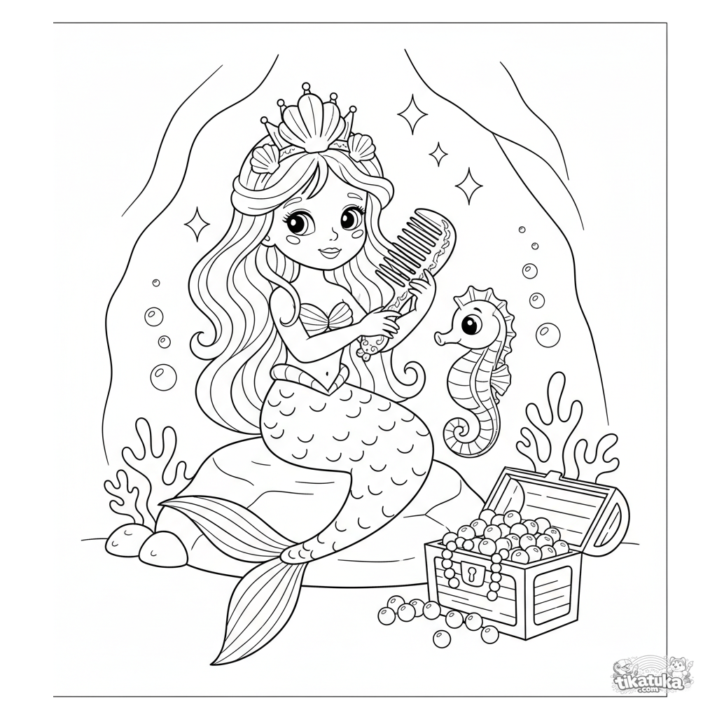 Coloring page for girls 4-6: a mermaid princess combs her hair in a coral cave with a seahorse friend. A magical underwater scene to color.