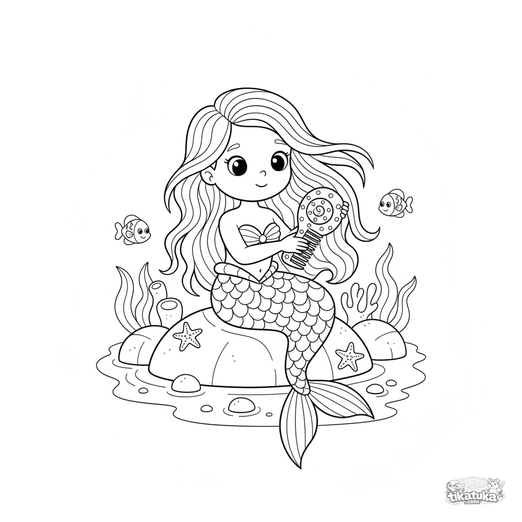 Coloring page for girls 4-6: a mermaid princess combs her hair with a seashell comb on a rock in a tide pool. Peaceful scene with sea details.
