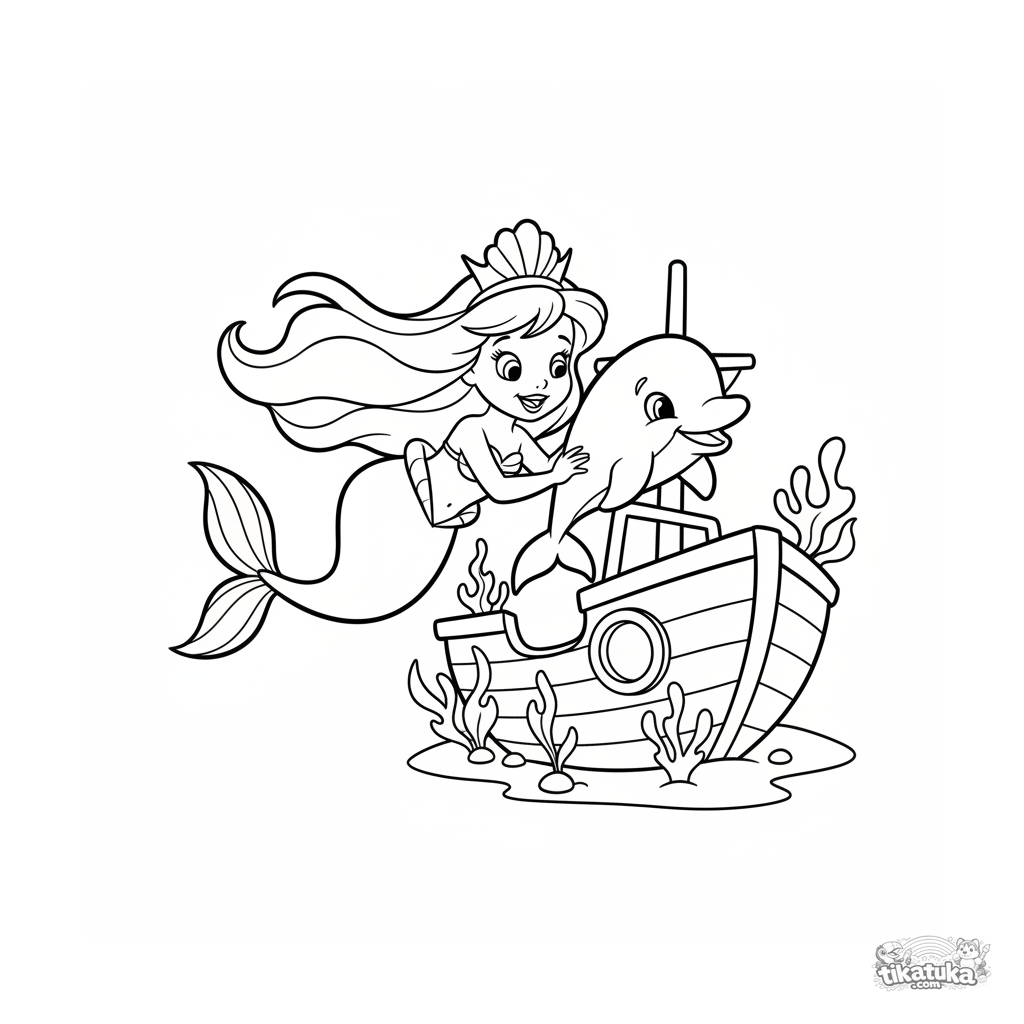 Simple coloring page for toddlers 2-3: a cute mermaid princess with a dolphin swims around a sunken ship. Large simple shapes.