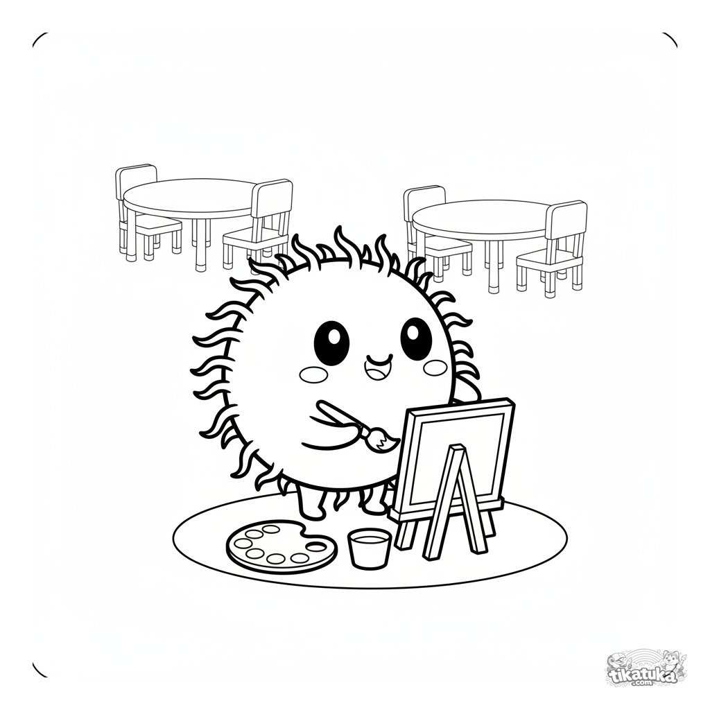 Toddler coloring page 2-3: a friendly microbe artist painting at an easel in a classroom. Simple, large shapes for first coloring.
