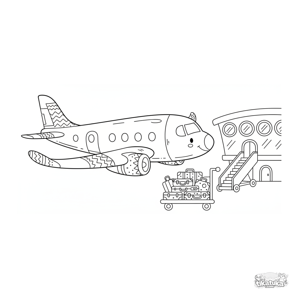 Detailed coloring page for older kids 10-12: a mid-century airliner in a constructivist style. The plane taxis past a terminal with airport details.