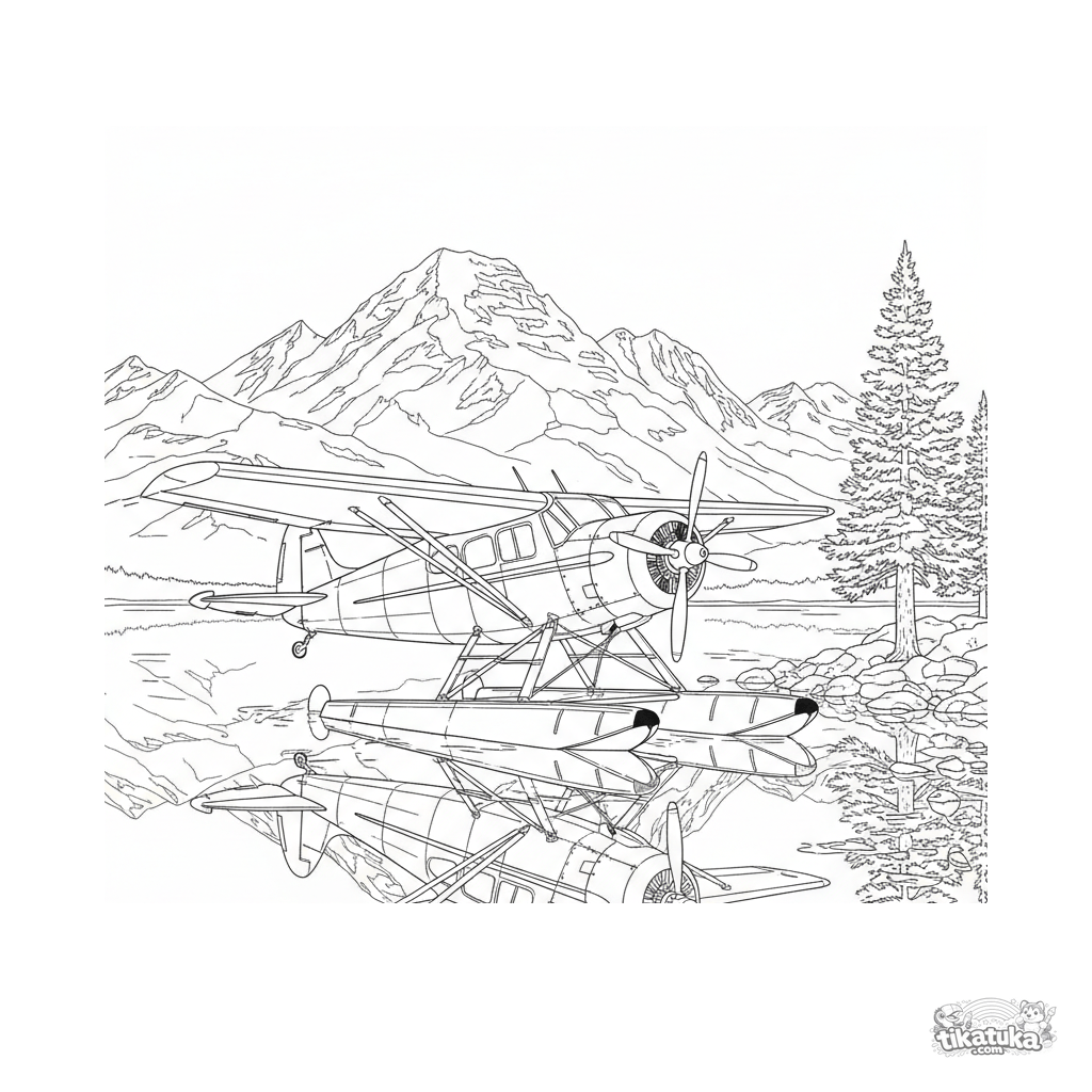 Detailed coloring page of a mid-century seaplane resting on a serene mountain lake. A realistic illustration for kids aged 10-12, perfect for developing attention to detail and a sense of composition.