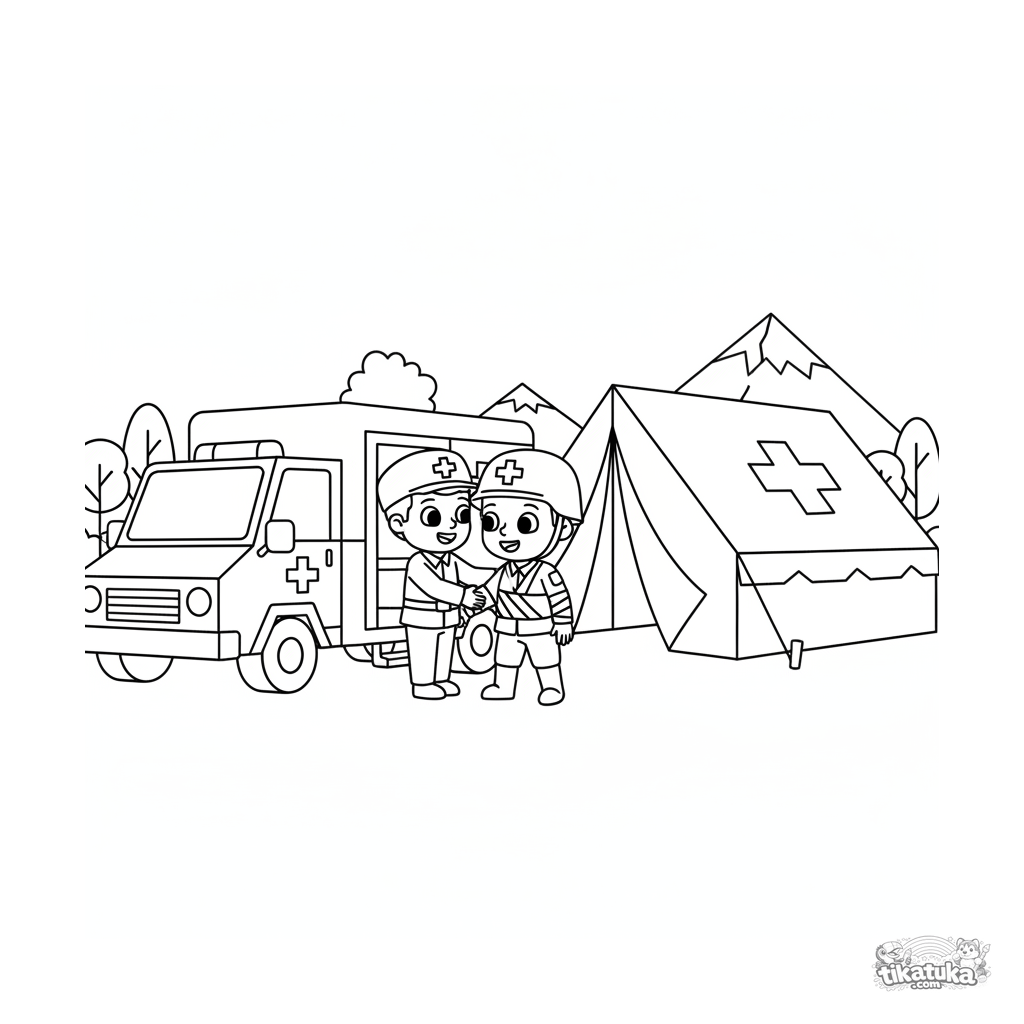 Coloring page for kids 4-6: a military ambulance with a red cross is parked at a field hospital tent in the camp. A medic helps a bandaged soldier.